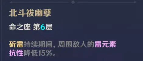 开Q大招的期间内,周围敌人雷元素抗性降低15%。属于比较不错的增伤效果。对于北斗本身的副C输出有实质性的提高,另外如果是雷系输出队伍,减雷抗也会对整个团队有着相当大的提升。