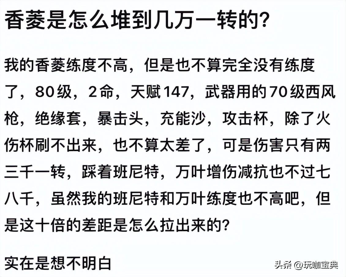 但是萌新玩家想的就不同了。(当然或许也不能说是萌新玩家,只是刚开始练香菱不久)大致是说裸伤3000,即便在班尼特大招上,再加上万叶减抗,也不过7-8000,想知道和几万一转的香菱大招伤害怎么差出来的?
