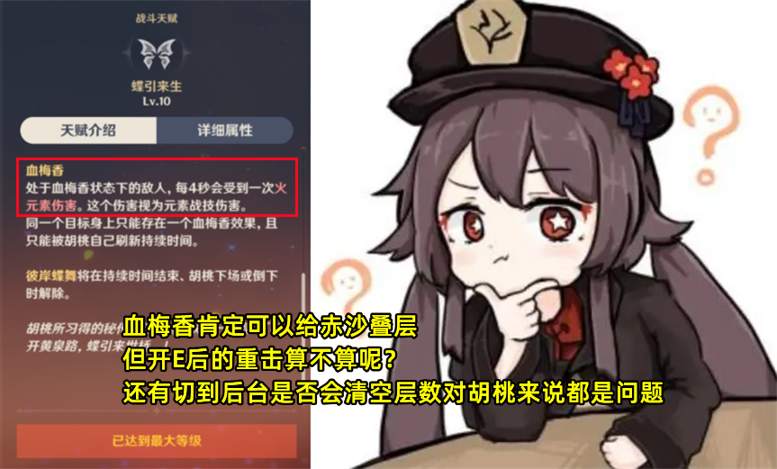 但有优点就有缺点,实战中胡桃用赤沙的伤害很可能不如理论中美好。原因就在于赤沙的叠层机制,注意看触发条件是元素战技命中敌人。假设胡桃开E后重击不能触发,那么只能靠4秒一跳的血梅香叠层,那么叠满3层时胡桃的E也该结束了;而1精赤沙0层和1层时的表现仅比匣里灭辰强一些,不可能再和护摩平起平坐。至于赤沙叠完层后切到后台是否会清空则有待实测,不清空的话倒还好,清空的话对胡桃来说可能就不是那么好用了。