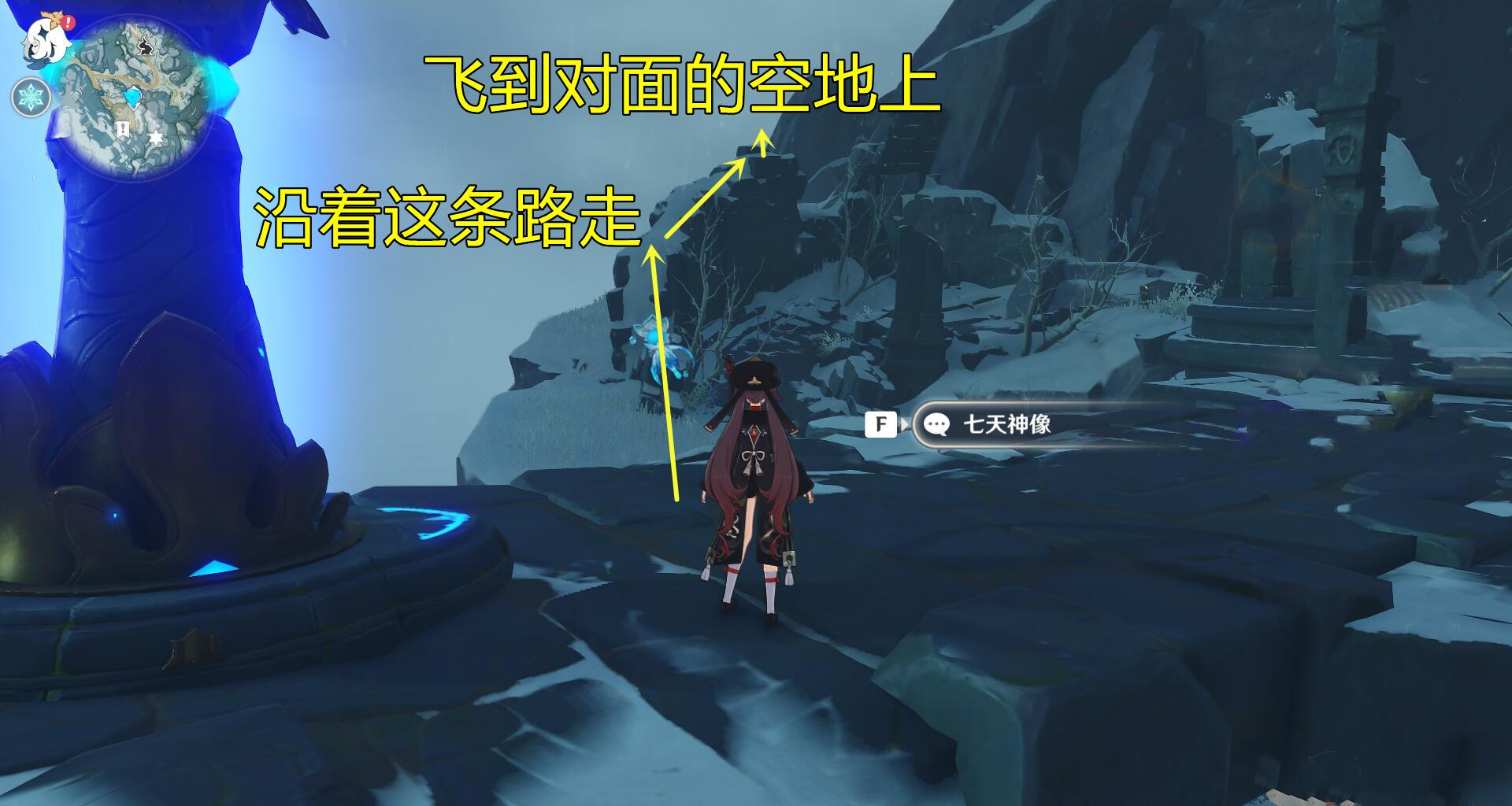 拿到这3个道具后,回到七天神像,沿上图标记路线前进,飞到对面打开圆门,进去就可以找到第8块石碑。
