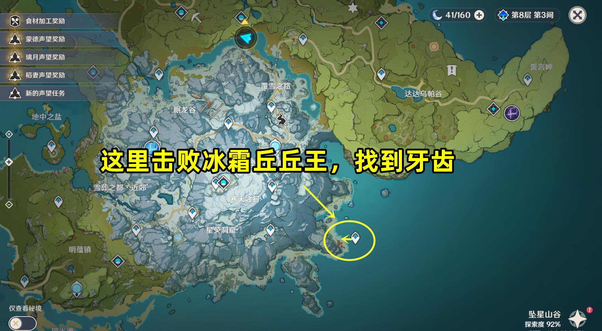 传送到龙脊雪山右下角的传送点,可以看到一个冰属性的丘丘王。打败敌人后,可以在附近找到一枚“奇异的牙齿”,开启任务。