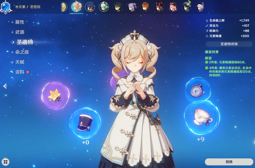 圣遗物的话,想要最佳的治疗效果,就带少女四件套,想要为队伍补充点伤害,就带海染四件套。四星圣遗物中,芭芭拉带流放者和学士四件套,能为全队角色提供不错的充能效果,教官套芭芭拉适合依赖元素反应打伤害的队伍。