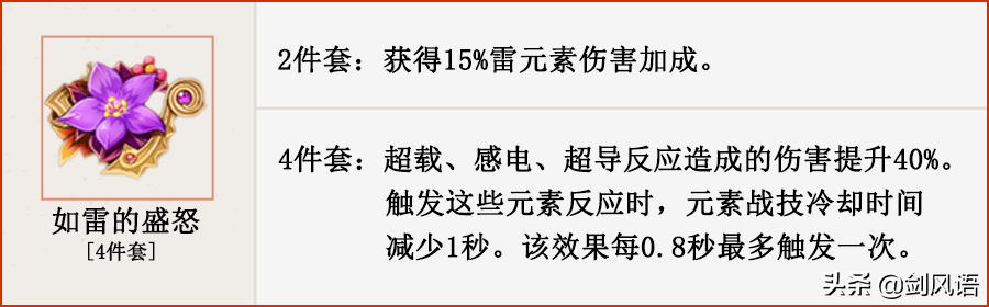 增加雷伤,提升超载、感电、超导反应伤害,同时还减少1秒E技能冷却时间。