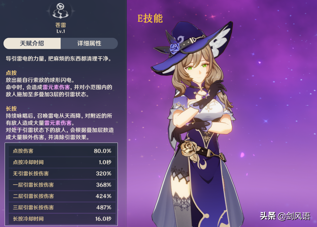 分为点按和长按。点按释放雷球,造成雷元素伤害,附加一层引雷效果。长按召唤雷电,造成雷元素范围伤害,消除引雷造成额外伤害。