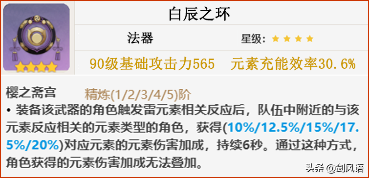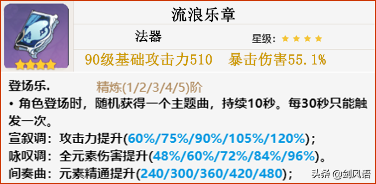 兼顾充能和元素伤害加成,最高可以给队伍增加20%元素伤害加成,性价比高,游戏内锻造获得。
