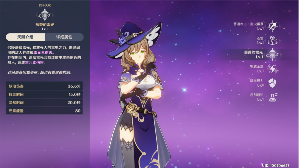 ·由于该debuff依赖于丽莎元素爆发的命中,且可刷新,而丽莎的元素爆发【蔷薇的雷光】持续时间为15秒,冷却时间20秒,也就是说在满足丽莎充能的情况下,可以一直给领域范围内的敌人叠加「静电场力」debuff,从而来增加已方输出
