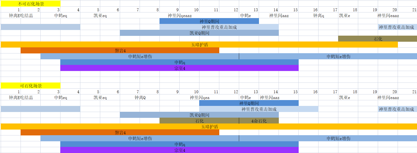 5、整个循环轴对操作有一定要求,例如细节上凯亚需要先e后q可以吃球并较晚结束q,以便吃到申鹤第二发羽毛,钟离长E及Q后需要适当走两步听到吃结晶音效,神凯开q需要站在申鹤q圈里锁定buff等,实战中由于熟练度未必能完美处理,需要一定的练习;