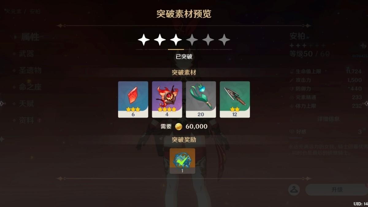 首先是最容易达到的50级突破,技能444,这个阶段应该是25-30级有在认真培养的角色会培养到的程度,大约是花后期3天的体力就能培养出来。所以这个阶段我觉得就算是培养安柏也完全不浪费,前期也会满舒服的。再来是60级突破,技能666,这个阶段应该是35-40级有在认真培养的角色会培养到的程度,大约后期8天体力,比刚才阶段还要多花后期5天体力。到这个阶段我觉得如果是芭芭拉或丽莎这种后期偶尔有机上场会或某些配队能用的角色,培养起来也不算浪费。