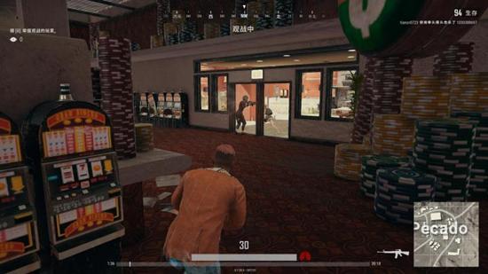 我这局因为跳伞速度慢的原因,选择了不跳拳击馆,而跳了赌场。落地之后通过观察落伞状况,听落伞声音,发现赌场一楼门口跳了两个人。
