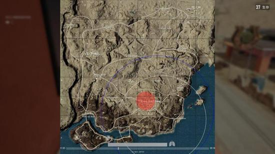 我回忆当初Pecado跳了十多个人,我击杀了五个,算上在拳击馆看到的盒子,毒圈逼近,我判断Pecado应该只剩下一两个人。然后我看到安全区位置,再会议飞机航向El Pozo与Monte Nuevo两城市应该有不少跑毒的人,我决定去Pecado路边击杀跑毒的人。