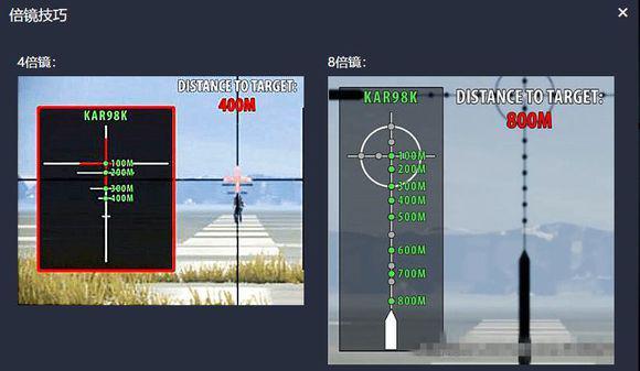 新手狙击手往往最怕的就是远距离的敌人,因为真的很难打中。但是很少人去分析为什么远距离的人打不中,很多人说不知道怎么抬枪。其实并不是这样,你只是不知道敌人离你有多远而已。抬枪很简单的,只不过是用镜子上的另一个刻度去对准敌人的头部罢了。这个版本的八倍镜和四倍镜完全契合98K。中心点打100M,第二个点打200M,依此类推。