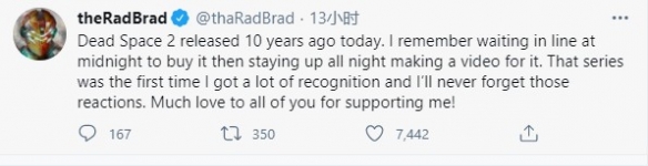 网友“theRadBrad”:《死亡空间2》在十年前的今天发售了,我还记得在半夜里排队购买,然后熬夜为它录了个视频。这是首个让我获得认可的游戏系列,我永远不会忘记看我视频的人的反应。感谢所有支持我的人。