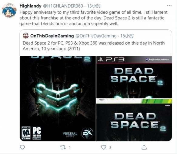 网友“Highlandy”:祝我第三喜欢的电子游戏周年快乐。我仍然为这个系列感到惋惜。《死亡空间2》仍然是一款出色地融合了恐怖和动作元素的游戏。