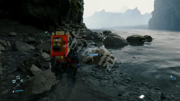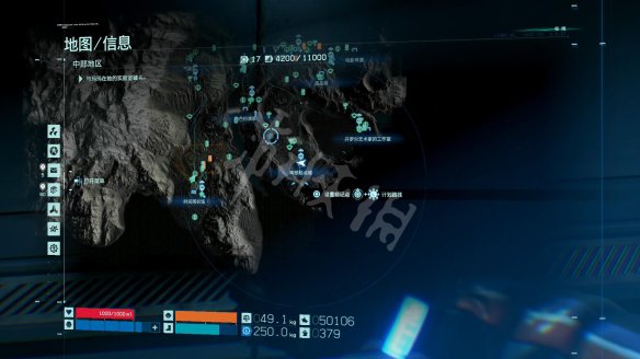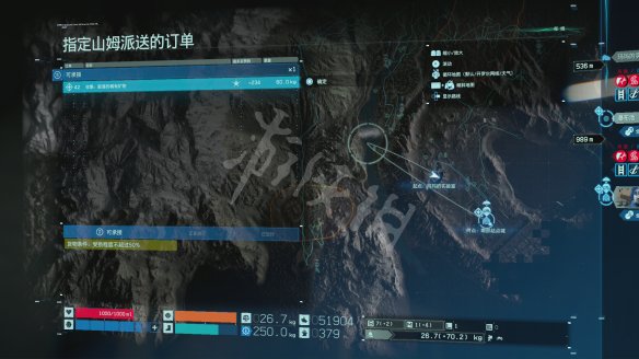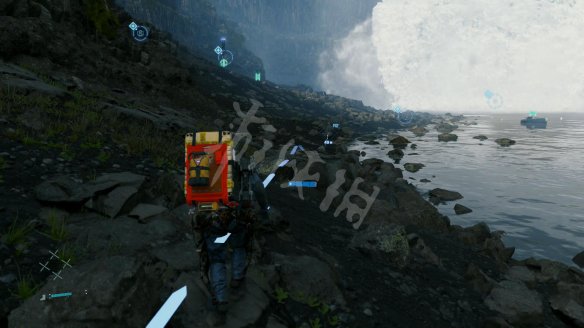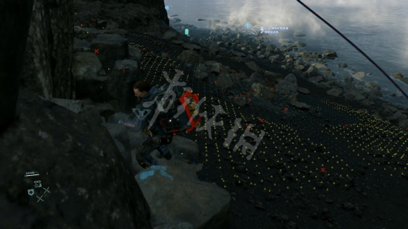 利用攀爬柱下到谷底。按R1键扫描,可以看到河边有一箱订单需要的矿物。