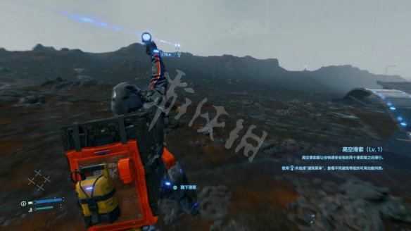 此外解锁新的建筑“高空滑索”。这是之后流程中非常重要的移动设施。玩家在两点之间建好滑索后就可以快速穿梭滑行。不过要注意滑索间的有效距离为300米,另外滑索一般要建在高处,这样路径就不会被山体、石块等障碍物挡住导致无法穿梭。玩家在设立时可以根据上方的蓝线来判断路线是否畅通。我个人推荐之后的一段雪山流程中,出门要多带几个搭建器LV2用来搭设滑索,这样便于返程和来回跑。