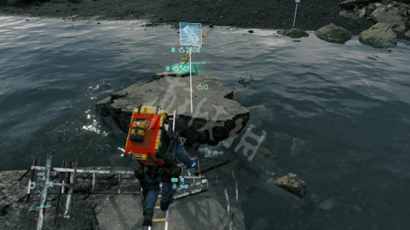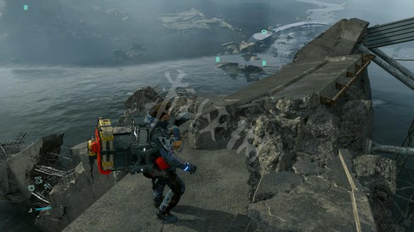 另外三箱货物在河对岸。这里河比较宽,中间又是深水区不能直接架桥,卡车开过去也容易沉底。如果之前完成[订单No37.角色扮演家]获取水獭帽的话,就可以直接游泳游过去。没有的话就老老实实沿着河岸走,中途可以绕到对面,不过无论哪种方式最好都事先在岸边设个滑索,毕竟就算是山姆能游泳,身上的货物还是会因为水流漂走的。