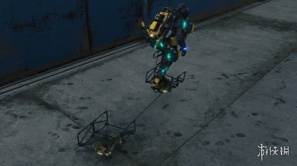 玩家最多可以连接两个悬浮机,也可以踩上一个拖着一个走,如下图,同时两手依然可以携带最大2XL的货箱,不过只建议走平坦地形或坡度不大的下坡。
