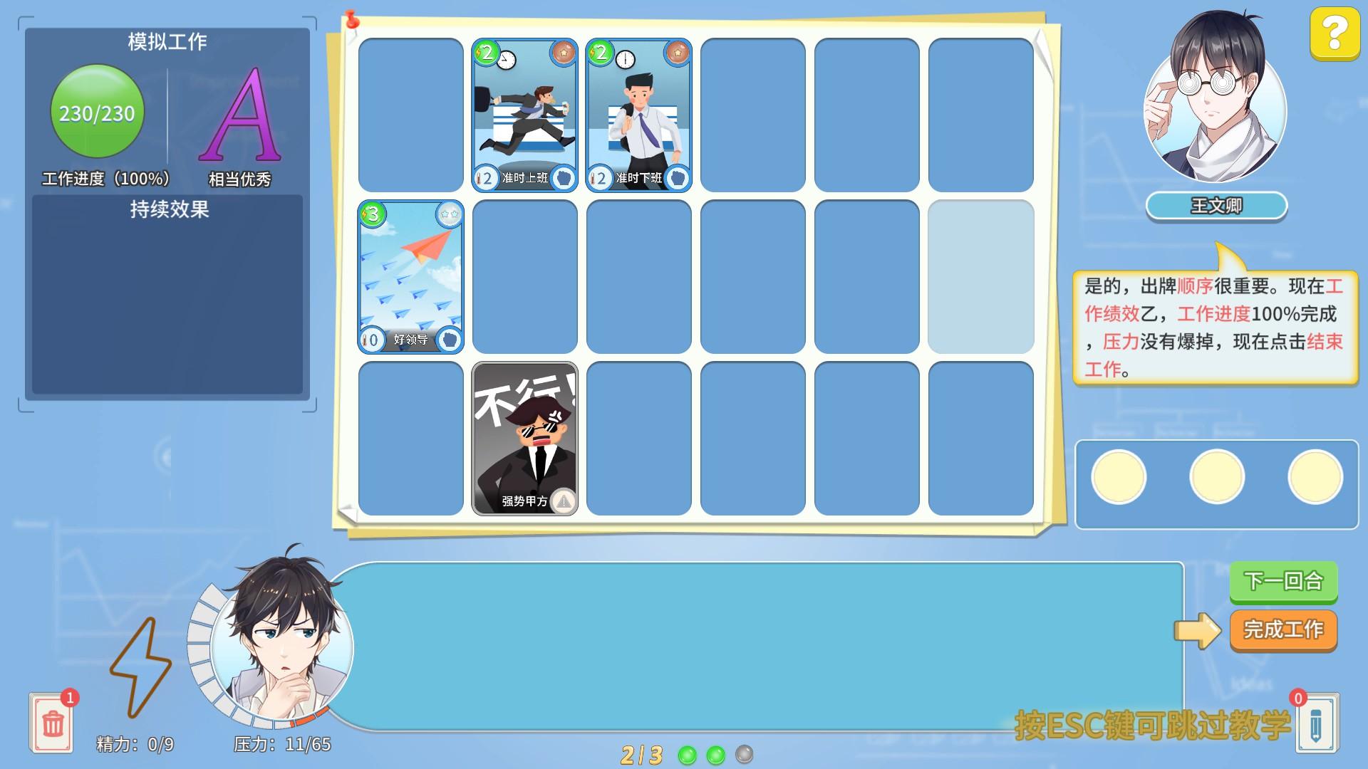 打出卡牌时,我们注意打出卡牌的前置条件是否已经满足,还需要考虑到卡牌效果是否能形成配合,并将卡牌放置在正确的位置以触发效果。本作的卡牌战斗体验看似少了些针锋相对的“战斗”氛围,但却突出表现了工作中事前计划、合理行动的运筹帷幄之感,这种设计是十分合理的。丰富的卡牌让玩家有很大的策略空间,各种不同的流派更是体现了不同的职场态度——有的卡组甚至是以“加班”为核心的,看起来有点苦涩,但却实实在在地能解决工作中的问题,这样的设定也是很接地气了。