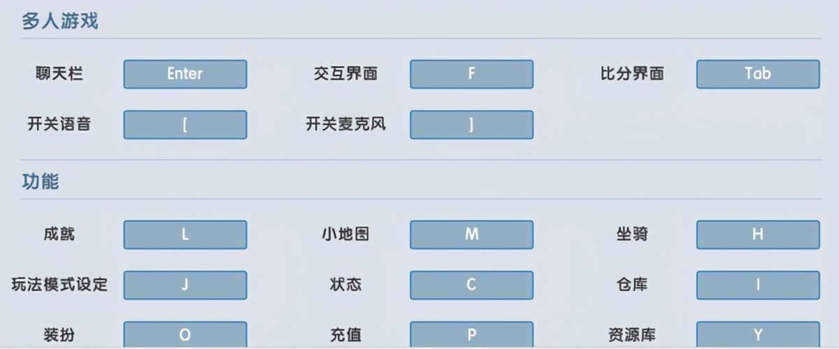 其实在多人模式里面,玩家还有很多可以操作的点。而这些,就需要使用快捷键进行操作了。喜欢联机的小伙伴,对这些按键应该非常熟悉。如果想要尝试更多的地图话,就需要对这些按键进行了解了。其中多人游戏需要使用的按键不多,看上图学习就可以了。功能性的按键,则比较多,只需要记住小地图为M、坐骑为H就可以了。