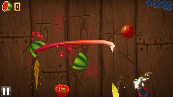 6、如果一堆水果同时被掷起来,先从体积小的下手,因为它们下降得更快,而且需要切得更准确7、将手指保持在离左上角的“最高分计数器”往下1英寸的地方,这里是大多数水果能上升到的顶点,把手指保持在这里可以切得更笔直、连续8、最重要的是运气,自己把握吧~