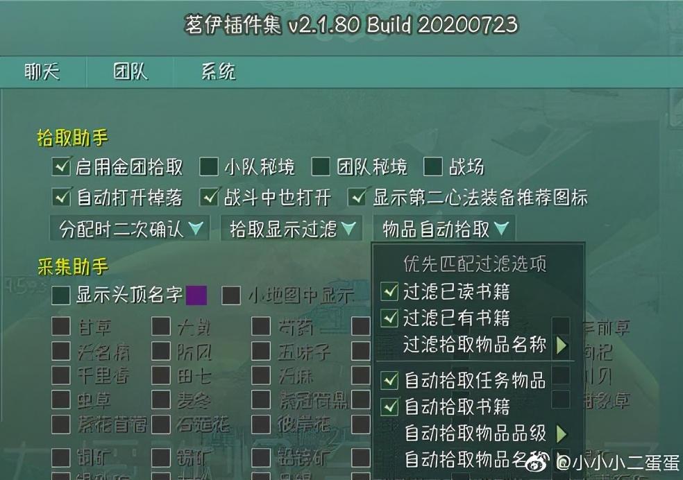 游戏内外设置: 1、游戏内 esc-游戏设置-操作开关-切换操作模式-摇杆模式 esc-游戏设置-操作开关-基础操作开关-关闭自动全部拾取 (摇杆模式会自动转面向到攻击自身的目标,所以即使目标在自身身后也能打到。这里不用系统的无差别自动拾取,楼主一直参考的是微博@小小小二蛋蛋 的茗伊插件拾取过滤设置,按照下图设置即可)