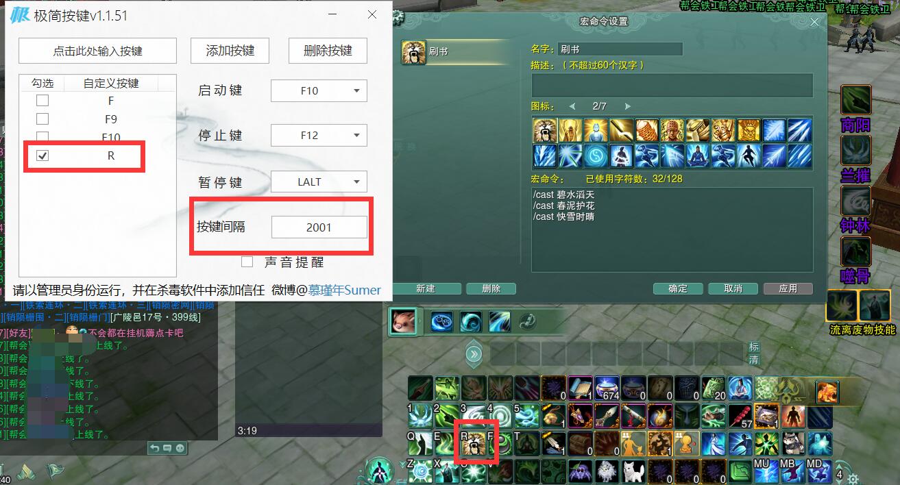 游戏内外设置: 2、游戏外 首先以极简按键界面为例。设置好宏、技能栏,按键界面设置好启动键、按键键位、按键间隔。 (按键间隔不用太快,不然可能会一直断读条,在下刷110乱世藏剑小怪用2000左右差不多。)