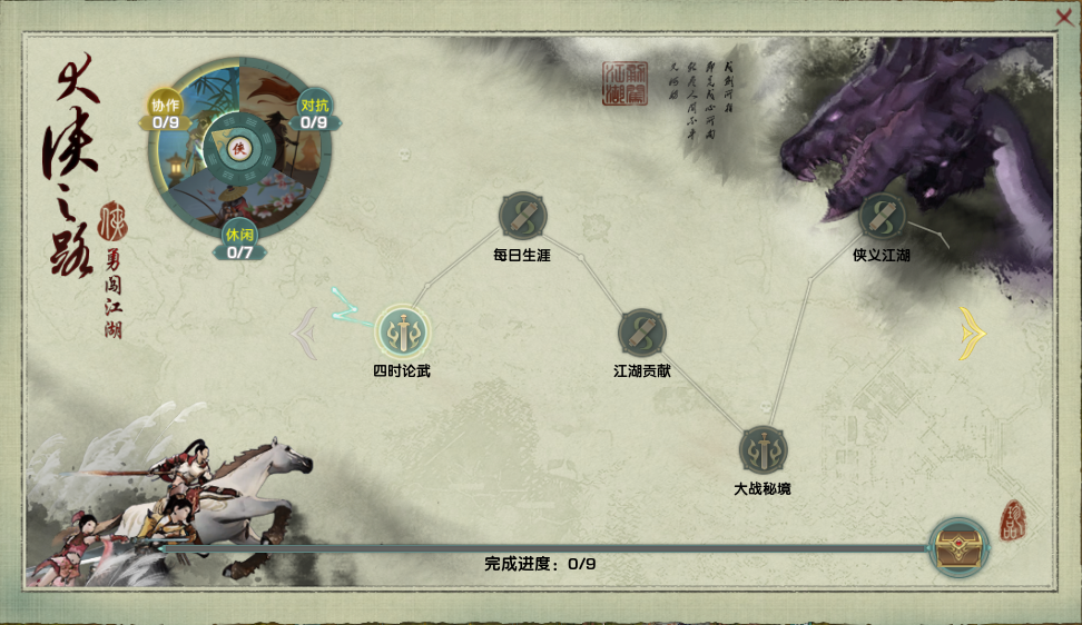 那么我们先来介绍PVE的主要入门玩法吧,这就需要我们点开大侠之路的“协作”部分,点开之后我们会发现每个任务是层层递进由简入繁的,为的就是帮助各位萌新好好地了解这个游戏PVE的玩法。