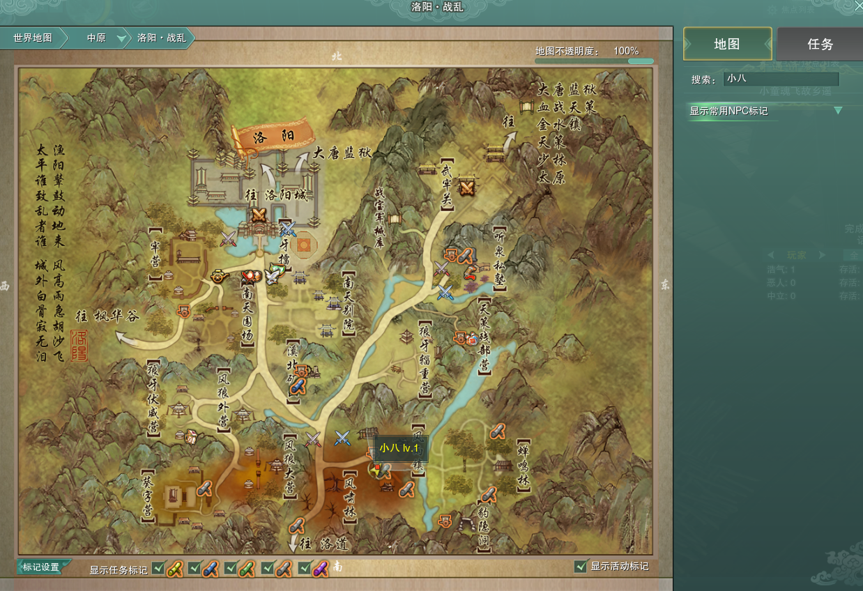 此时直接飞往【战乱洛阳】的风雨镇,找到剧情里的NPC【小八】。