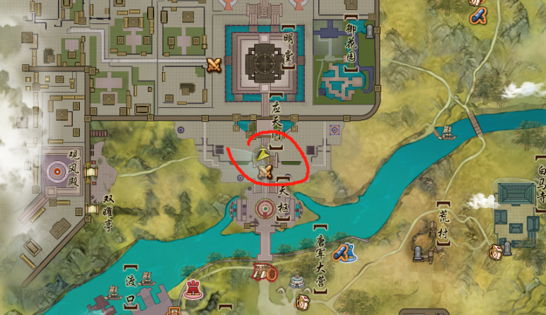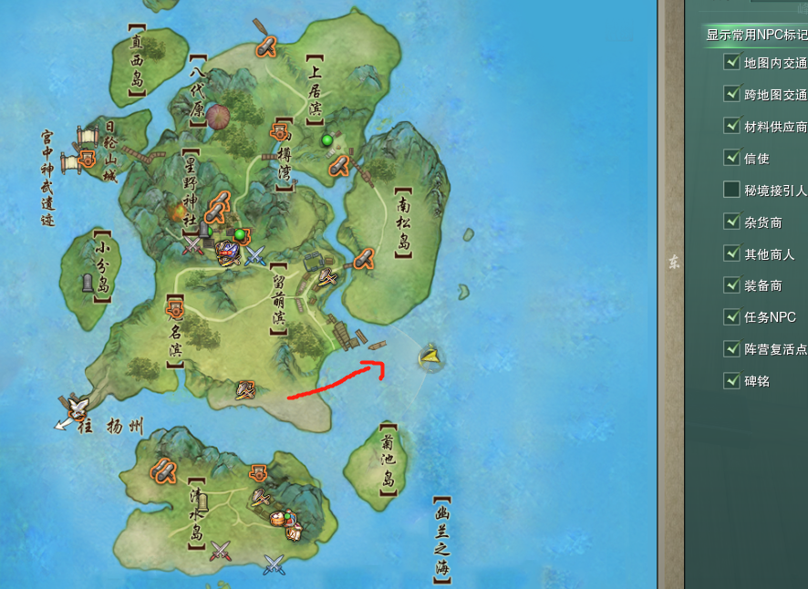 位置在这个方向,飞过去【梁师道】旁边就有了。