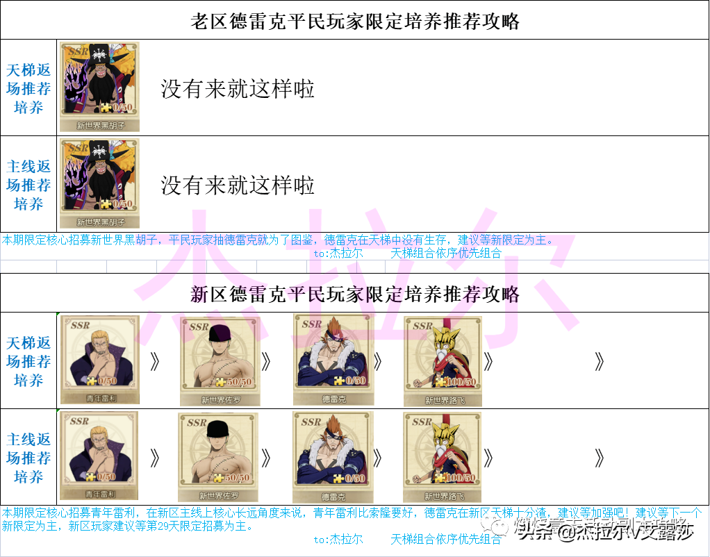 本期限定核心招募青年雷利,在新区主线上核心长远角度来说,青年雷利比索隆要好,德雷克在新区天梯十分渣,建议等加强吧!建议等下一个新限定为主,新区玩家建议等第29天限定招募为主。