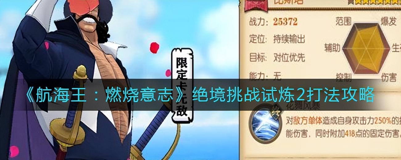 《航海王:燃烧意志》游戏中绝境挑战已经开启,试炼2推荐搭配布琳、新豹子、老沙,那么今天小编就给大家介绍一下航海王燃烧意志绝境挑战试炼2打法攻略,有需要的小伙伴不要错过了。