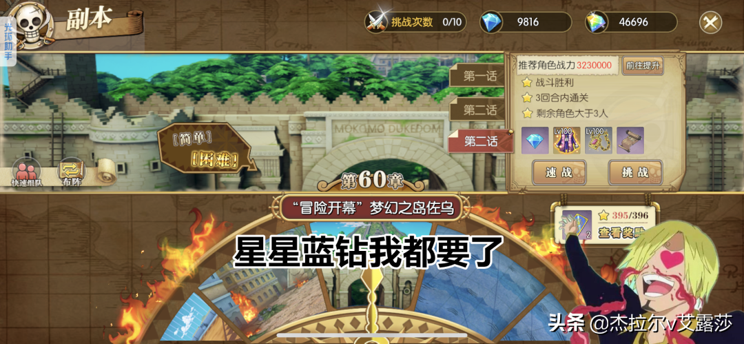 这里是教大家如何每天白嫖100蓝钻的方法,就是我们的剧情回顾,不要点速战,而是点挑战,并使用AB阵容的队伍去调整,A队一个100级人物+4个1级人物去挑战剧情回顾打出1星的评价。然后使用B队天梯国家队再来挑战刚才的剧情回顾关卡,评分变回3星,你也获得了20个蓝钻奖励,如此类推,这样你一天剧情回顾能有100蓝钻收入啦。