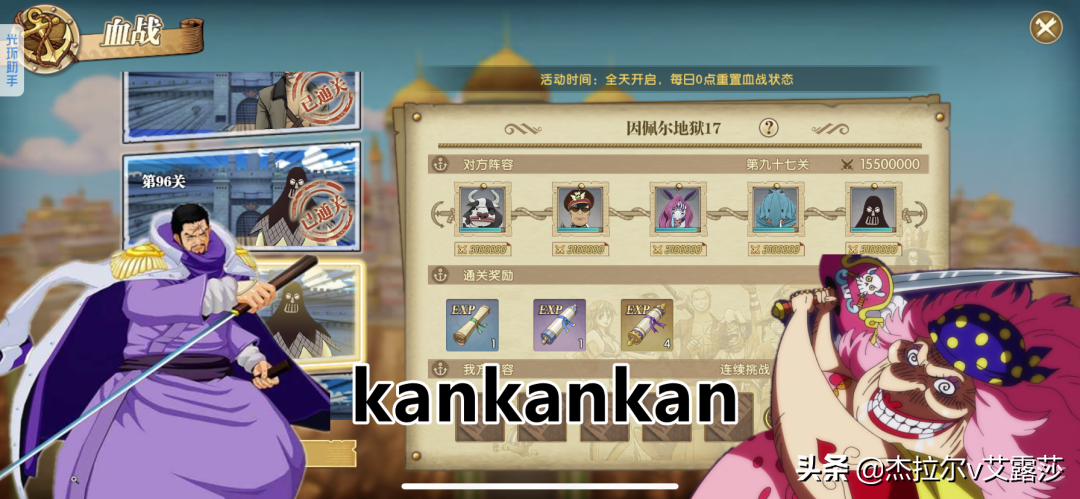 每天都可以血战,不过血战的时间更加久了,没有一天扫荡功能,累啊,更加重要的是,血战获得的蓝钻没有以前多。我们的血战一周所获得的蓝钻由4800到现在1400,宝石获取来源基本是依靠悬赏与血战。