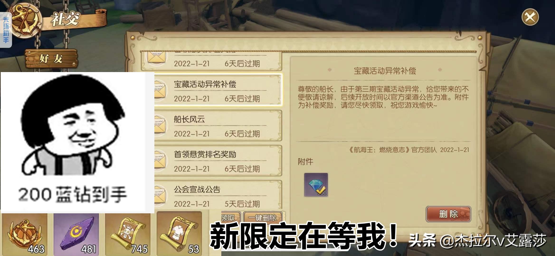 哈喽,大家好,我是杰拉尔,本期攻略跟大家一起来了解,燃烧意志2.0里面,我们获得蓝钻的途径有哪些?蓝钻有多重要,大家知道吗,他能给我们人物附魂,他能给我们装备用来打孔,他能给我们的航海远证刷新到强者卷子,而强者卷子是我们最最最宝贵的资源,也是我们能否招募到最新限定关键因素之一,所以你们说蓝钻是否重要,还是烂大街呢?
