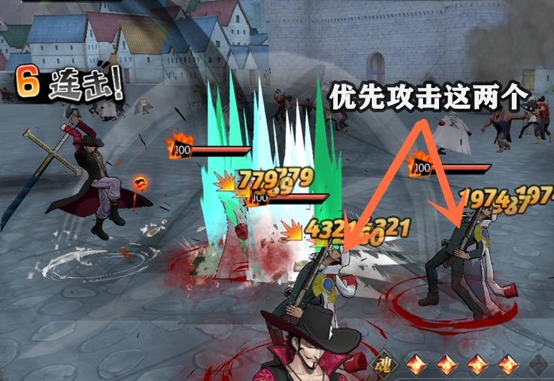 也就是我们要打两波小弟,很难受。不过这里也有小技巧,那就是避开前面的白衣小兵,这货血量高,不好击杀。可优先攻击其他两个小兵,这两个都是脆皮,很容易击杀。只要击杀其中一个,三人则全部消失,赤犬现身。