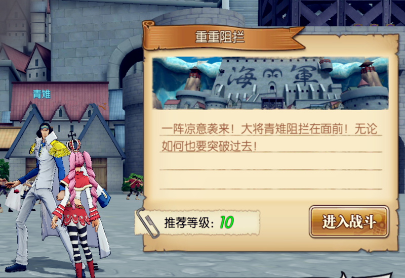 必备的角色是白胡子,没有白胡子,想要通过这一关基本上是接近于绝望的。白胡子的眩晕控不住青雉,但是白胡子的中断青雉是吃的,因此我们将白胡子放在前面,让青雉与白胡子拼运气,谁中断对方的次数多,谁的胜面就大一些。此外白胡子还可以提供不俗的输出能力,是本关的不二之选(赤犬也可以,有超高属抗)。