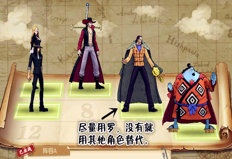 2、带上罗是看上了罗的输出、减伤以及复活能力。罗的大招对麦哲伦有30%的降低伤害的效果。甚平的位置可用其他角色替代,但最好是续航能力比较强的,毕竟要正面扛伤的。