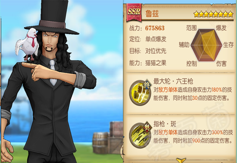 伤害量和当前的热门输出小马哥、白胡子有段差距,但变身后反杀能力极强。血量低于30%后,豹子形态的闪避、速度可以提升到60.5%与71%,极度恐怖。且破甲能力极强,在路奇面前想要靠防御属性存活,几乎不可能。