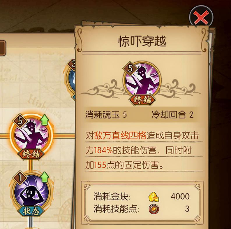 这里两个终结技能都是可以用的,除了特定的环境下,主要还是选择【惊吓穿越】状态附加恐惧效果。而另一个终结技能【幽灵响指】状态附带驱散效果,理论上是可以对抗一些无脑增加BUFF的的阵容,譬如老沙、女帝这种带有群体BUFF的能力(只是理论上,具体有兴趣的玩家可以自己去测试。)