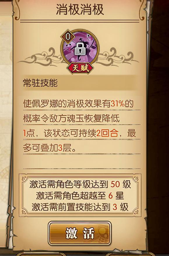 消极消极点满。佩罗娜的第二个天赋,能够降低敌人魂玉恢复。本来这个天赋其实让佩罗娜有机会登场的,但是70战阵的出现,让佩罗这个同样切后排的角色,只能控到后排一人,因此尴尬了。