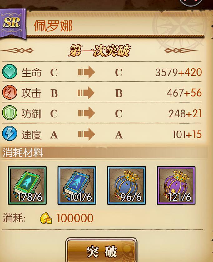 佩罗娜的技能配合状态都是5、3、2的,很好搭配。本来如果没有三突,佩罗娜是有机会上场的,毕竟速度基数比较高。现在的话,80级别的被动是速度强化,勉强可以跟上脚步。但70战阵让先手后排的佩罗娜很尴尬。