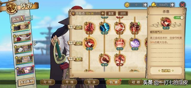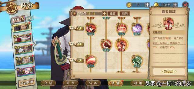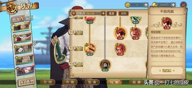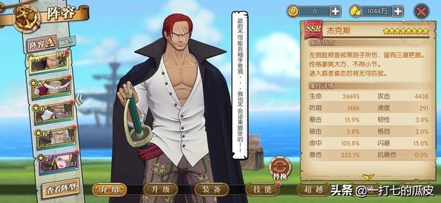 总结:四皇六芒的加成还是很高的,红发虽然被动加的不多,但是气势5层后加的非常多。是一个能抗能打,能复活,可以翻盘的角色。问题是主要输出靠霸者以后的奥义伤害,80级以前都不是很强力。好在6星就可以上场不是一定要八星。但是你没有更好的培养角色的话。红发是一个很好的选择。