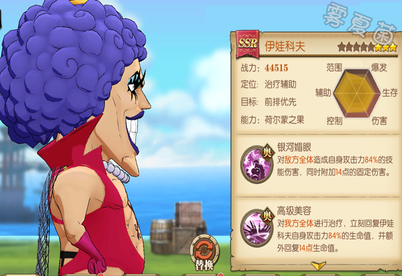特别辣眼睛的一名角色,比动漫中还要辣眼睛。所以一直以来本菌尽量避免提及这名角色,不过不可否认,人妖王伊万科夫,的确也有着自己的独到之处。复活、治疗、高速、净化、增魂增怒、控制,男性BUFF、首回合奥义,足以让其风光一段时间。