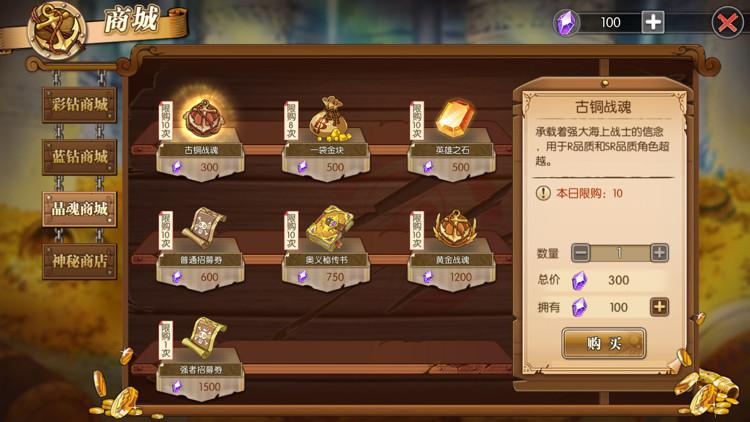 十抽之后多余的角色随便可以兑换晶魂,晶魂商城可以购买古铜战魂和黄金战魂,小编是把R,SR,SSR角色超越到满星后多余的碎片兑换晶魂的,虽然大概R角色和SR角色都升到满星估计也没什么卵用,但是为了满足一下小编的完美收藏欲望就都超越了,大家如果觉得没用可以不用超越直接兑换晶魂