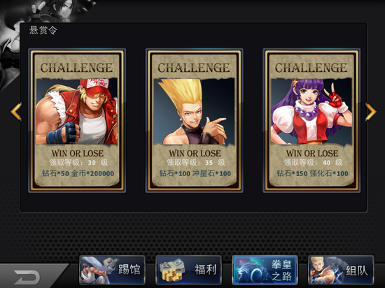 “拳皇之路”是《拳皇 97OL》特色进阶玩法,该玩法会在完成“醉拳对决”主线任务后开启,根据自身等级开放不同阶段的难度副本。通关后会获得海量奖励,每个副本只有一次通关 机会,所以难度会非常高哦,但是这条路上并不孤单,我们可以邀请并肩作战的战友一起战斗,完美的配合才能在通往拳皇的路上越走越明亮!