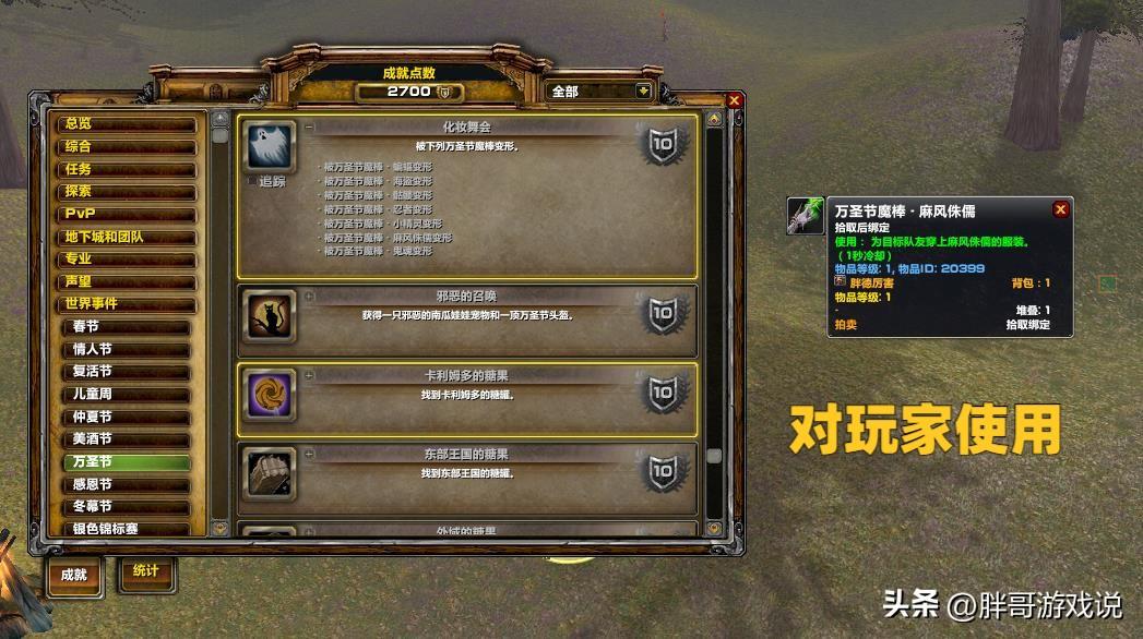第一个成就名为《化装舞会》,要求角色在万圣节期间被其他玩家变形。变形道具可以在旅店回去的糖果包里获得,如果有小号的话,可以让小号直接对大号使用,也可以找朋友帮忙,或者在世界频道喊其他玩家互助。