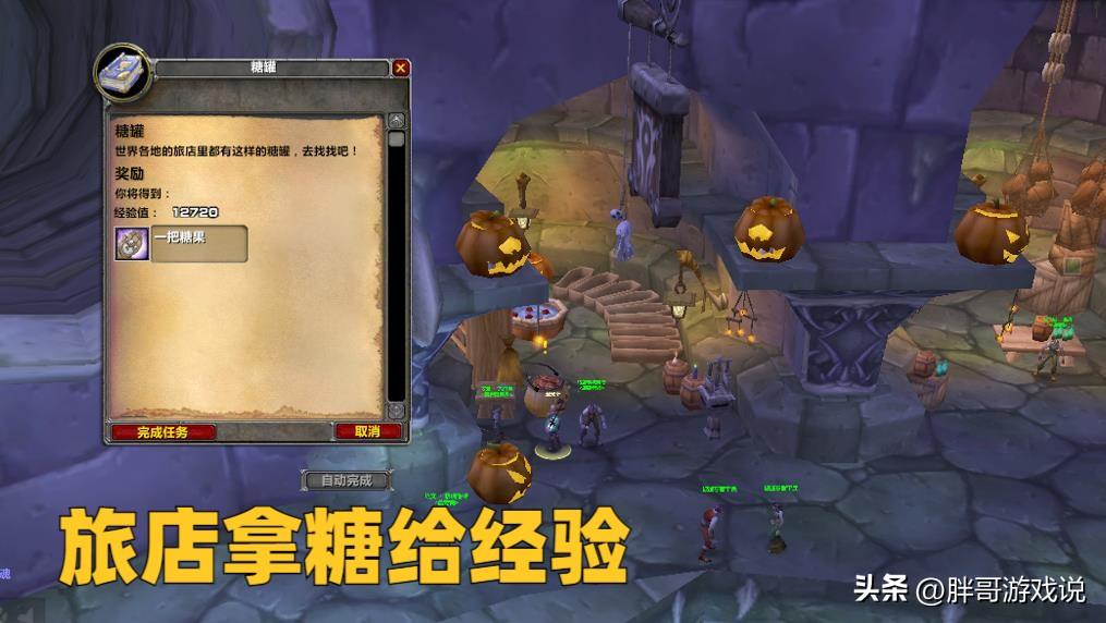 好消息是这个拿糖果包的任务是有经验的,并且享受传家宝的加成,胖哥76级小号单次可以获得12700点经验。全部开完的话,也能升一级了。