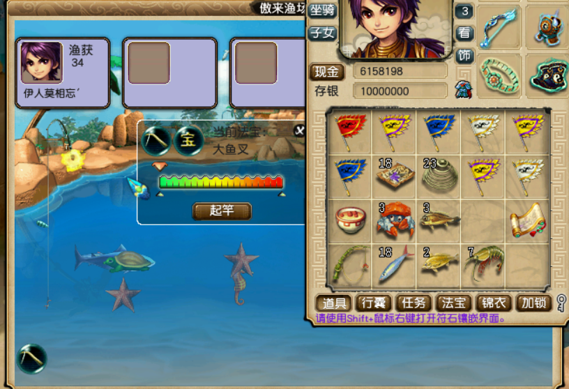 合理的使用法宝会带来最大化的收益。鱼叉要慎用,大鱼叉用一次1W,能不能命中,命中以后有什么东西全看脸。刚刚叉了一只鲨鱼,给了5000两储备金。