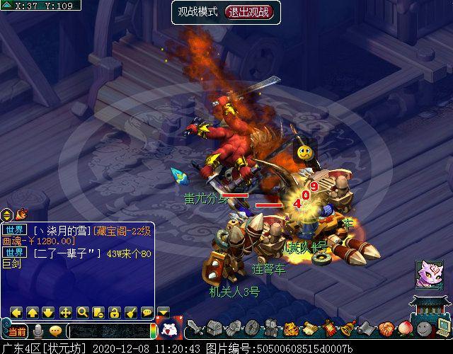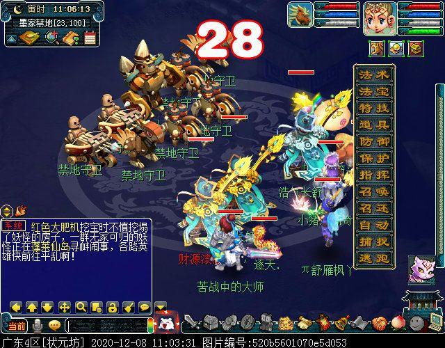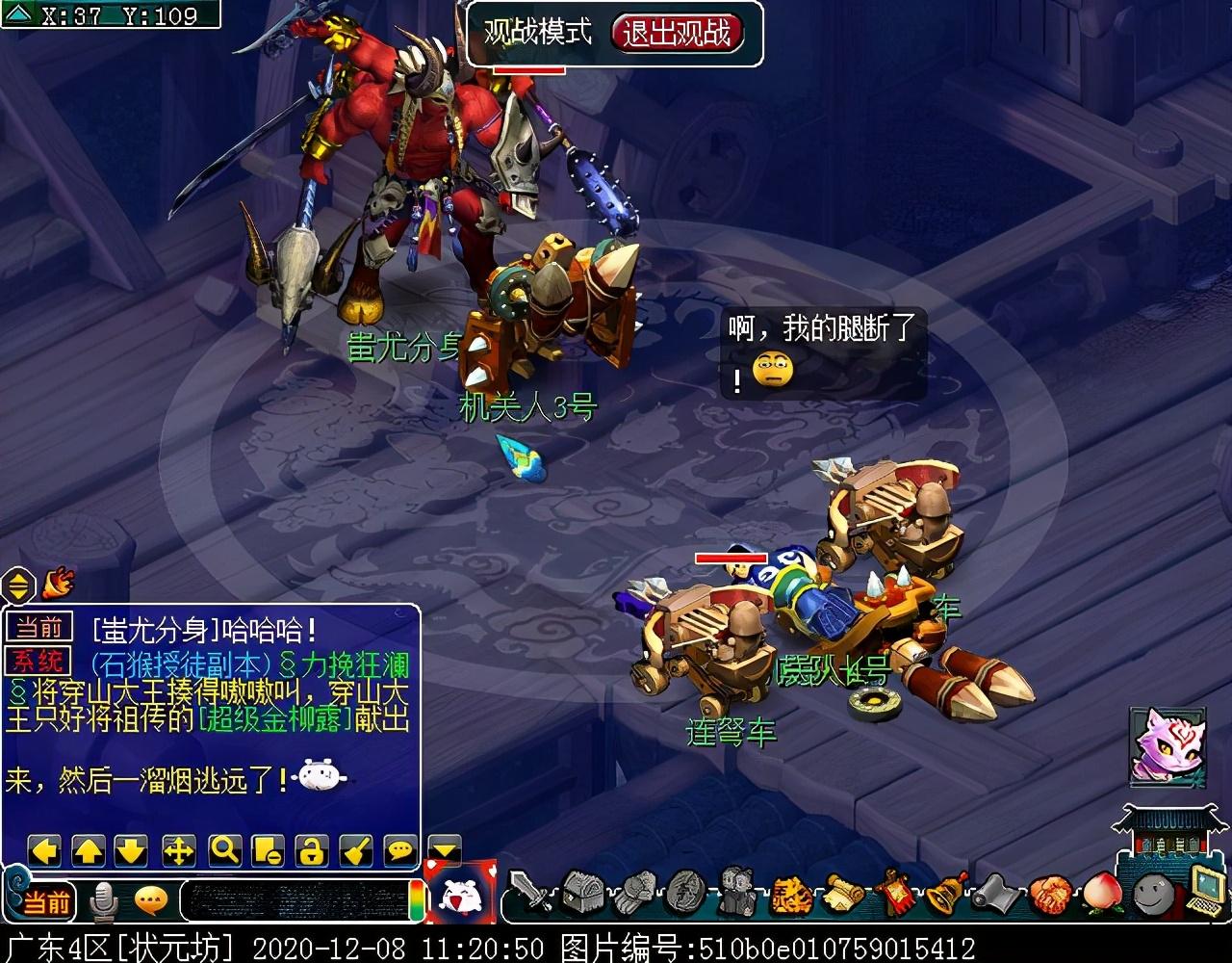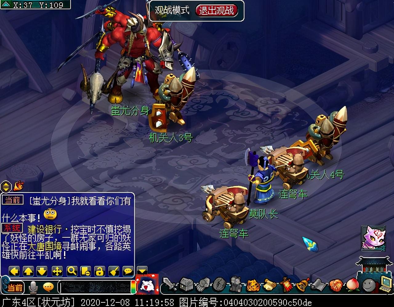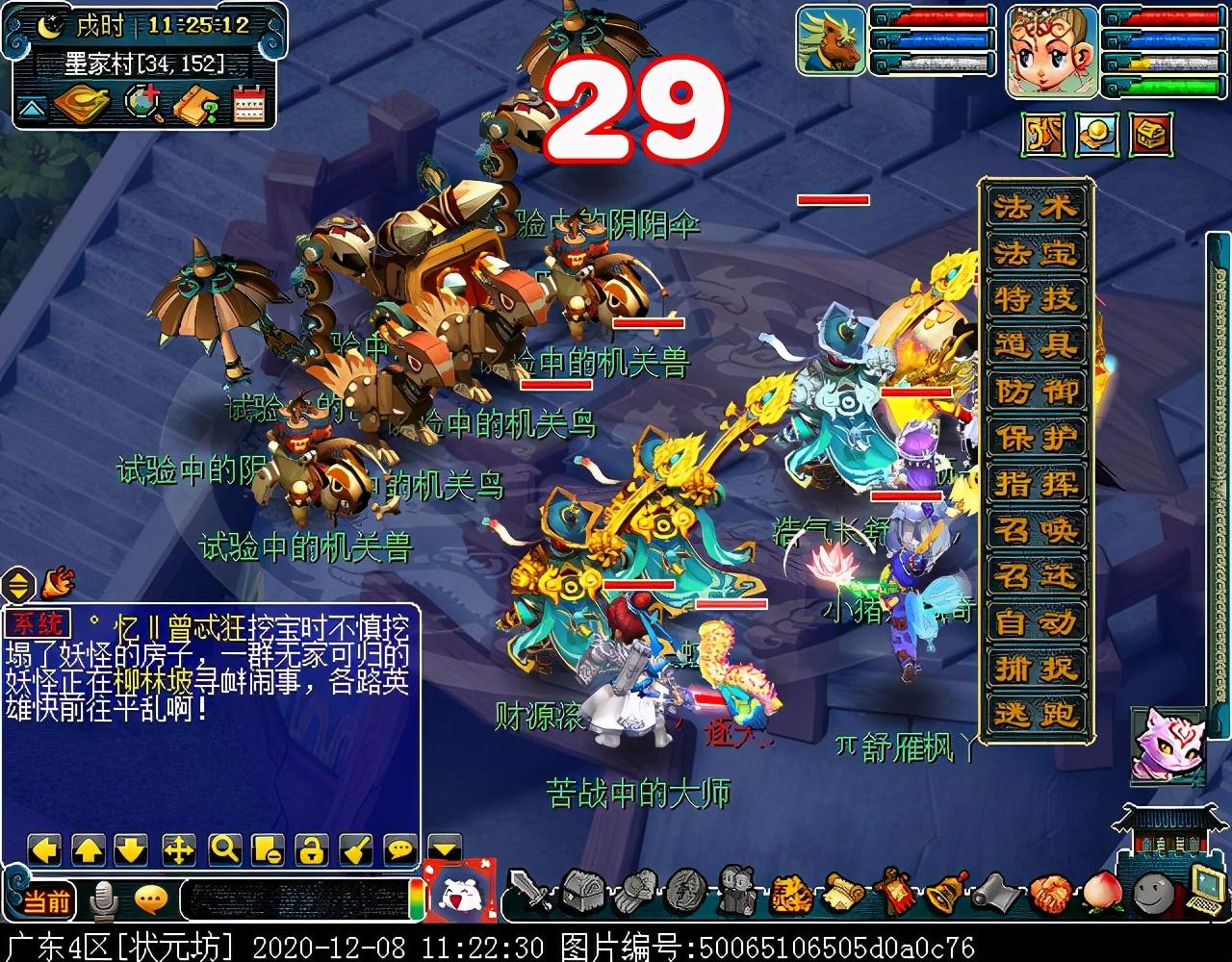 与巨子对话结束后会立刻切入战斗,主怪MW,会魔王回首/三昧真火/飞沙走石,其他怪物均会普攻,其中两条巴蛇伤害较高,其他怪物不足为虑,所有怪物均可封可毒。另外,本场战斗无论几人触发,均为满怪10个,建议组满5人再参战,怪物血量依旧较多。战斗胜利后可获855000经验和随机125召唤兽装备材料一个,成就2点,剧情到此结束!