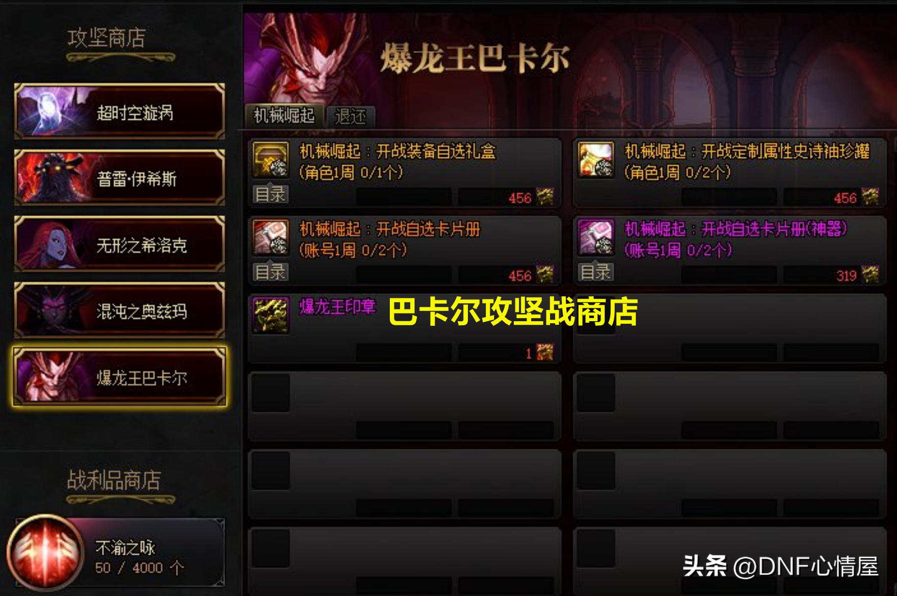 在攻坚战商店内,已经新增了“爆龙王巴卡尔”,塞进了一系列道具兑换,比如“巴卡妮”装备自选、自定义史诗罐子、传说和神器卡片册等等,但需要材料“爆龙王印章”兑换。
